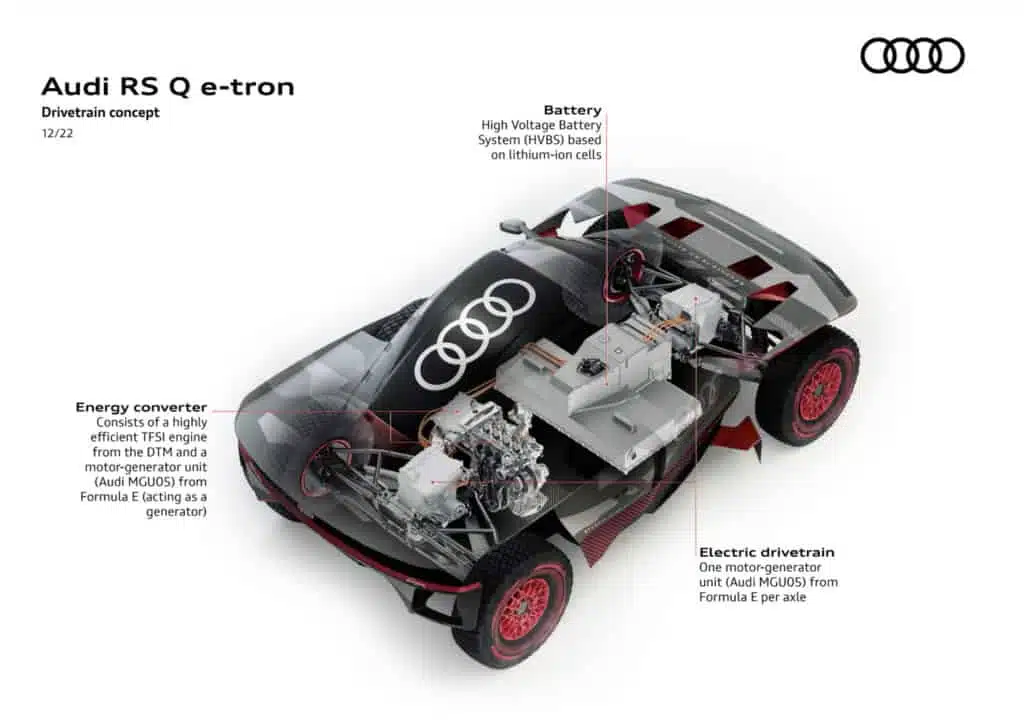 Og det er skam ikke nogen tilfældighed at Audien løb med sejren, for RS Q e-tron er udstyret med en elektrisk drivlinje med energiomformer, som består af en forbrændingsmotor, en generator og et højvoltsbatteri samt to elmotorer på for- og bagakslen.