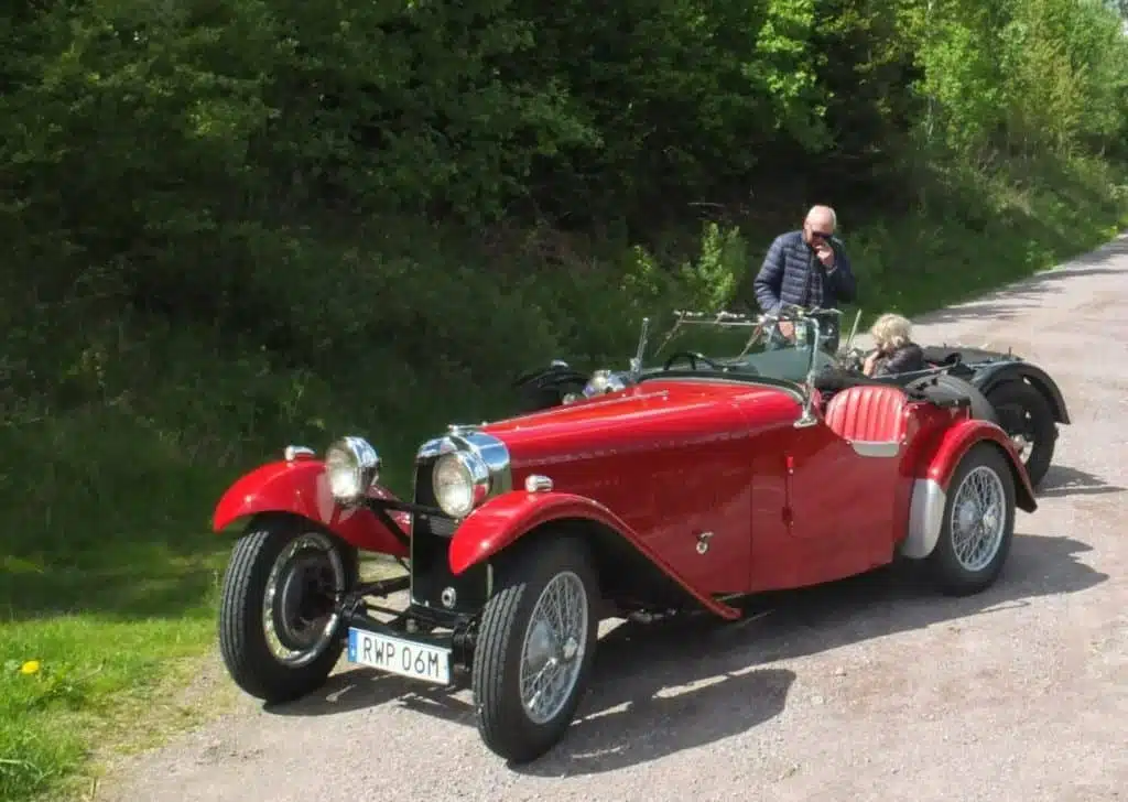 Lokalmatador Ernest Kristensen fra Vejle stiller vanen tro op i sin SS 100 fra 1933. Den store sekscylindrede sportsvogn regnes som forløberen for Jaguar-mærket.