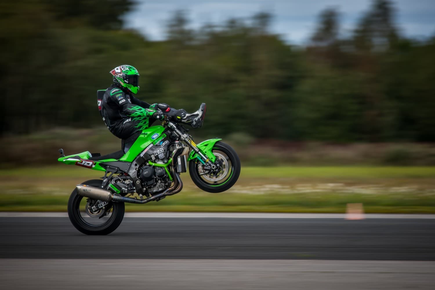 En plads der skulle skaffes med bagdelen placeret på tanken af en let ombygget Kawasaki ZX-10R, og med begge ben over styret.