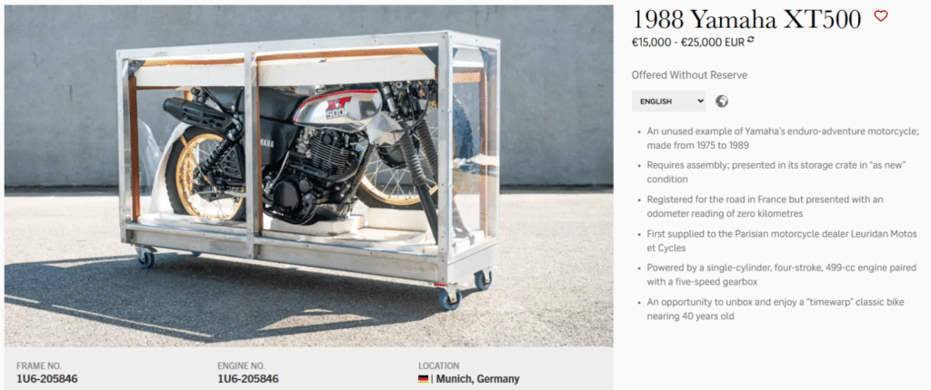 RM Sotheby’s beskriver den udbudte Yamaha XT500 med matching numbers som et ubrugt eksemplar af Yamaha’s enduro-adventure motorcykel, der blev produceret i årene 1975 til 1989.