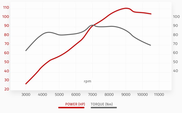 Effekten lyder helt nøjagtig 110,3 hestekræfter, og momentet topper ved cirka 92 Nm. Og ret interessant i forhold til netop dette er effektkurven, hvor 70 procent af det maksimale moment allerede er tilgængeligt ved 3.000 o/min; det betyder reel trækkraft, når gashåndtaget åbnes i udgangen af et sving.