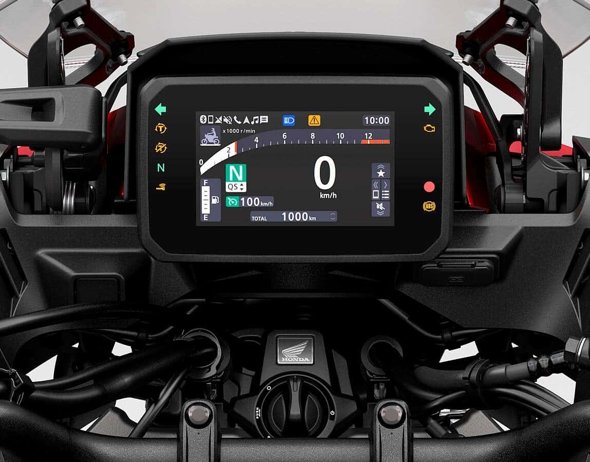 Standardudstyret er omfattende: Femtrins justerbar vindskærm, sidetasker, fartpilot, varme i håndtagene, håndbeskyttere, centerstøtteben og quickshifter.